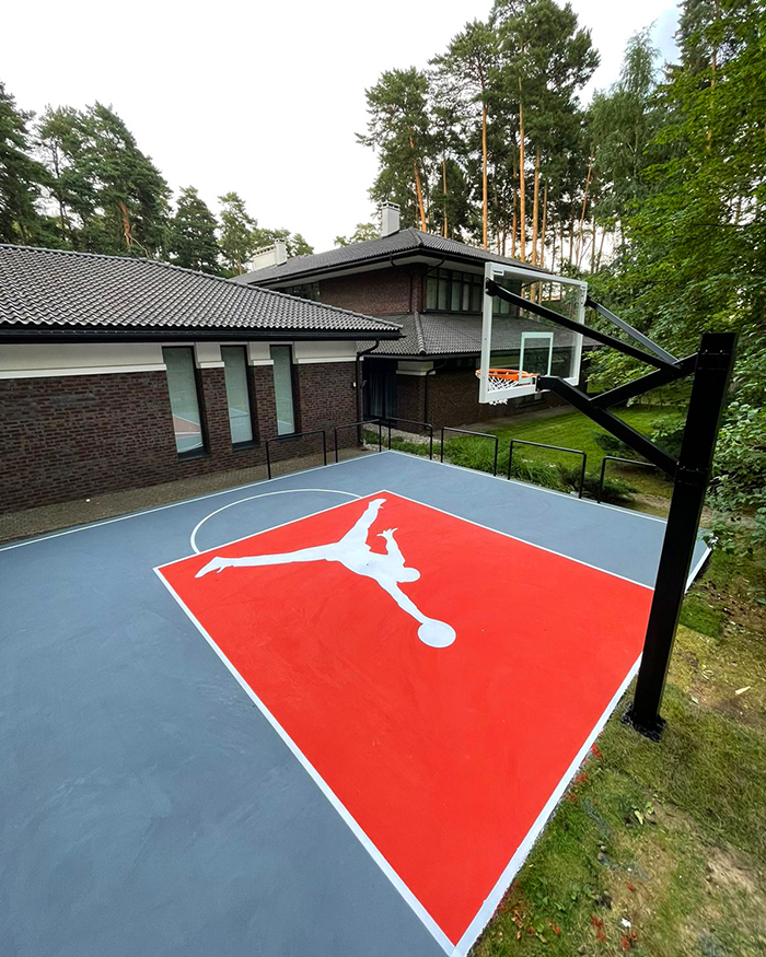 Частная уличная площадка для стритбола с щитом из каленого стекла и покрытием Hard, отвечающим всем необходимым требованиям атлета — правильный отскок мяча, сцепление с кортом и снижение травмоопасности. Также по желанию заказчика был нанесён логотип Jumpman.