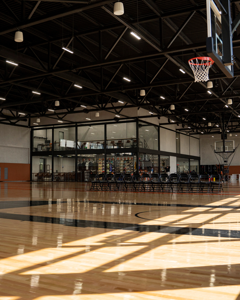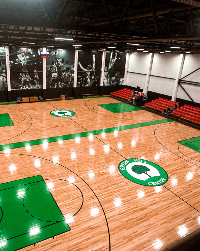 Спортивное пространство площадью 2500 кв. м. Включает в себя две полноценные баскетбольные площадки и два тренировочных корта-половинки с профессиональным покрытием из канадского клена, соответствующим регламенту NBA.