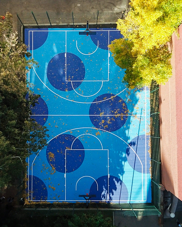 Отреставрированная баскетбольная площадка в центре Москвы на Патриарших прудах. Дизайн выполнен в стиле "Полька", что делает корт ярким местом на карте города.